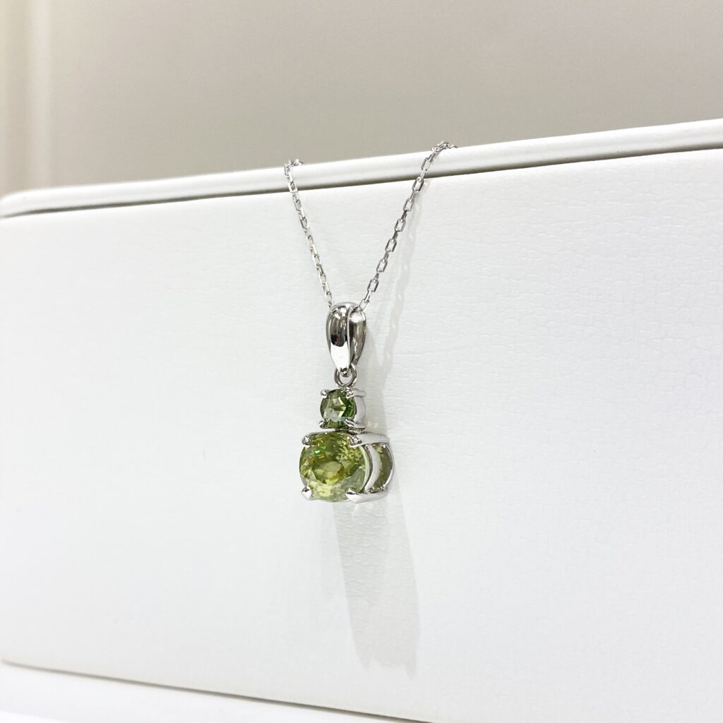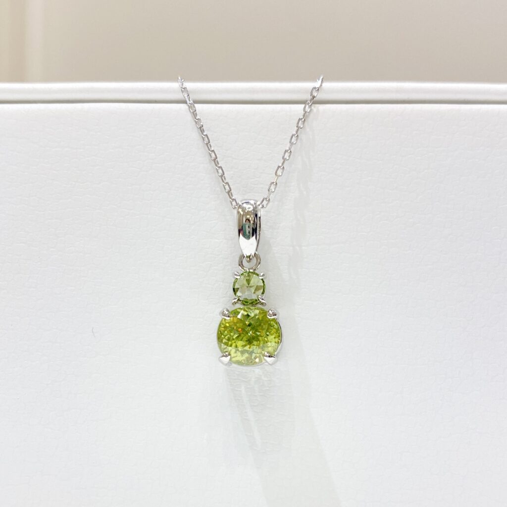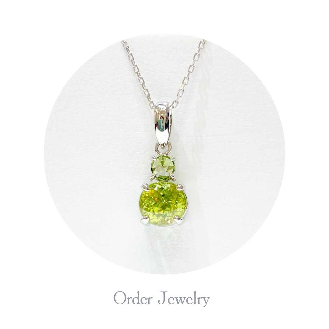 今回は、宝石の輸入もされているメーカーさんとのコラボ企画でしたので、スフェーンにふさわしいグリーンダイヤモンドを添えることによってオンリーワペンダントが実現しました。