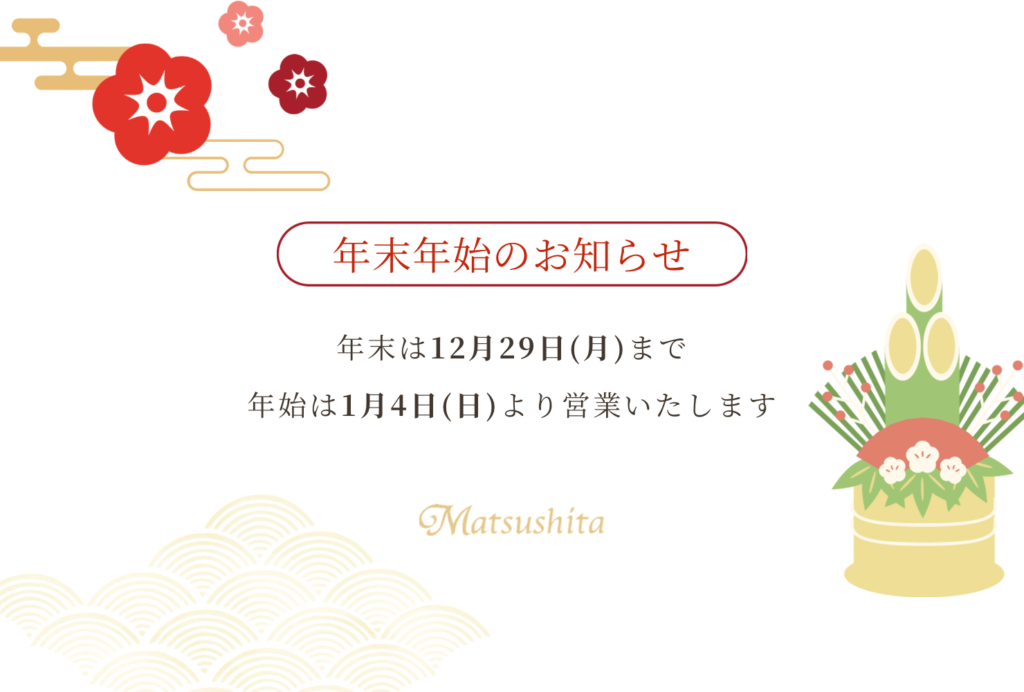 こんにちは。 愛知県豊橋市のジュエリーサロン、Matsushitaです。 いつもブログをご覧いただきありがとうございます。 ◆年末年始のお知らせ◆ 年末は12月29日(月)まで 年始は1月4日(日)より営業いたします
