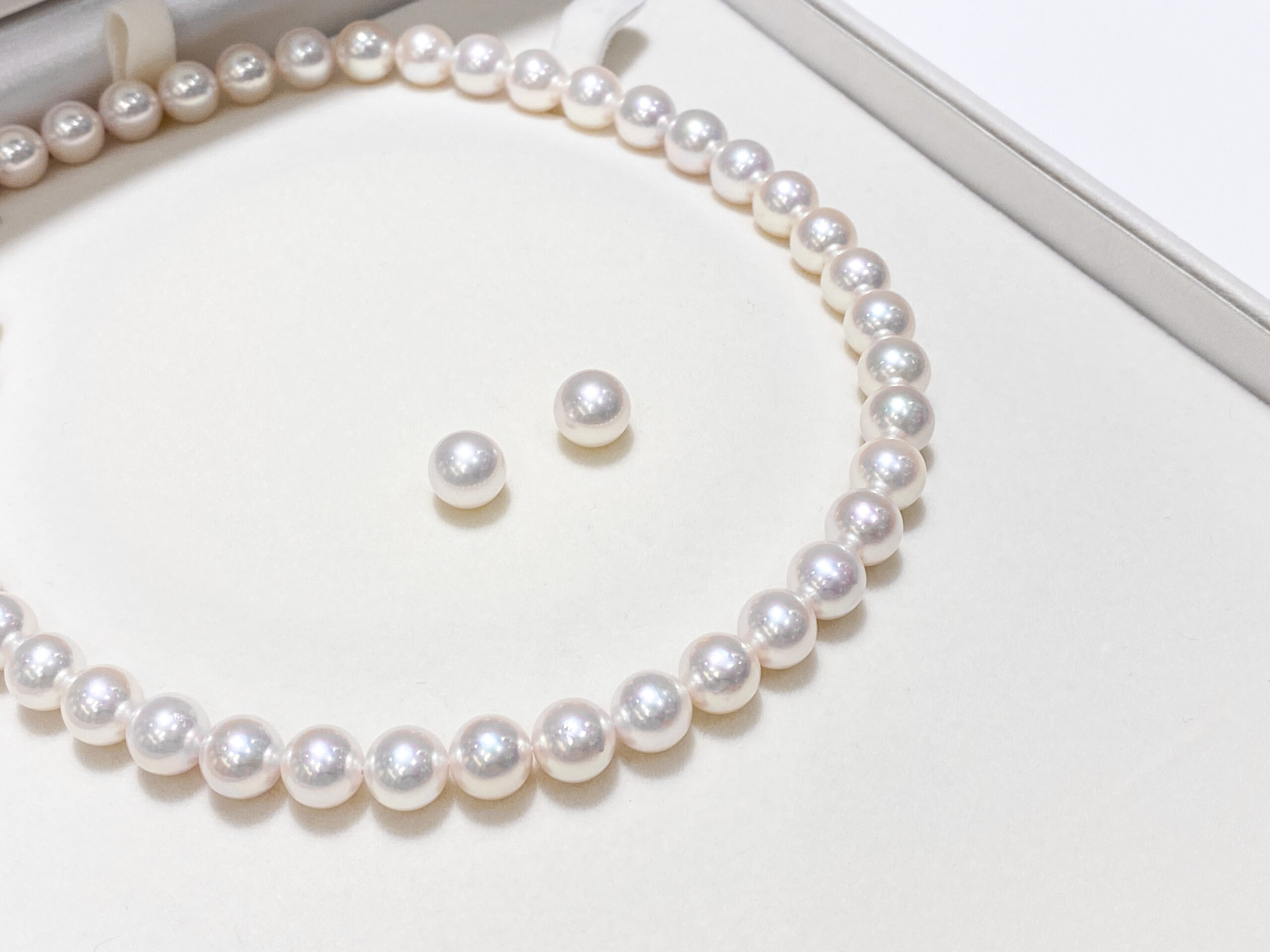 糸の伸びが気になりましたらお預けください。パールをひとつひとつクリーニング後、糸の交換仕上げをさせていただきます。納期1週間程度です。アフターケアもお任せ下さい。オンラインによる、アフターケアも承っております。